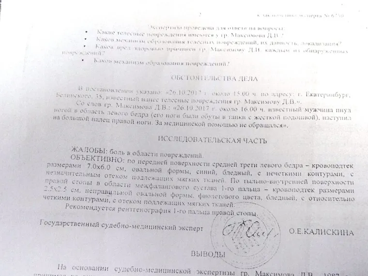 На следующий день родители малышки отправились писать заявления в полицию: мама — о том, что сосед наорал матом на ее ребенка, папа — по факту полученных от соседа ударов и прозвучавшей угрозе убийством. Ему тут же предложили пройти судебно-медицинское освидетельствование. Согласно экспертизе (она есть во всех материалах) у Максимова — кровоподтек на левом бедре и большом пальце правой стопы.