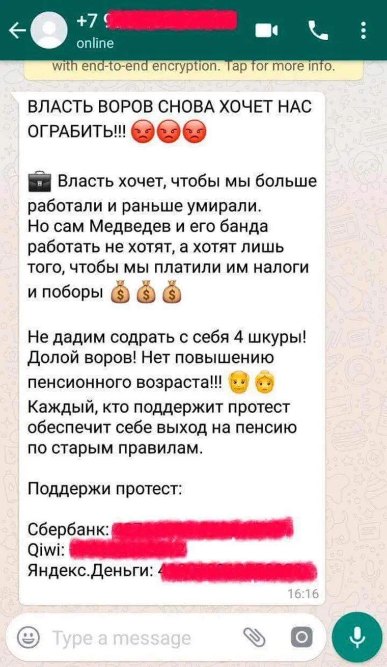 В мессенджерах начали активно распространяться призывы перечислять деньги на протесты против пенсионной реформы. О том, что в групповые чаты приходят подобные сообщения, «URA.RU» рассказали сразу несколько человек. Особенно популярны эти призывы в мессенджерах WhatsApp и Viber среди людей старшего возраста.