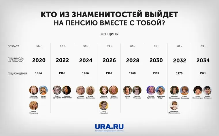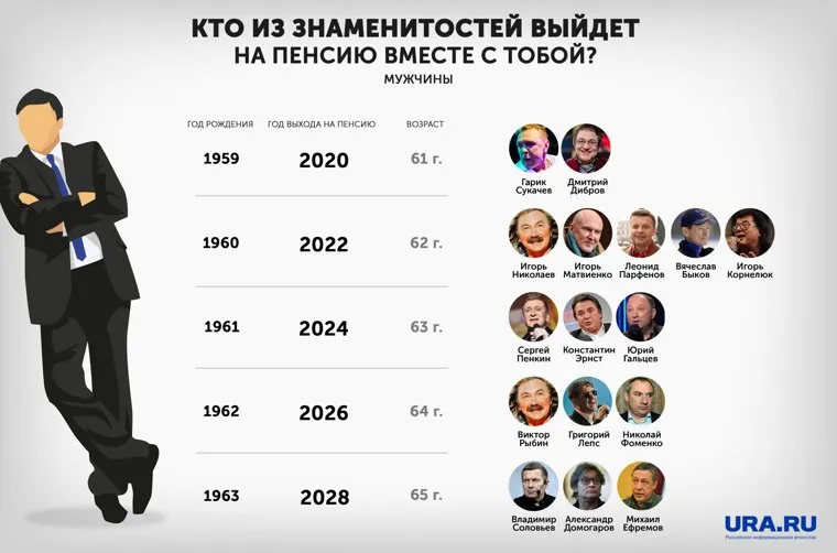 Предложение о поэтапном и многолетнем повышении пенсионного возраста — одна из самых острых тем этого лета. Она коснется подавляющего большинства мужчин и женщин, родившихся после 1959—1964 годов. «URA.RU» изучило, как изменение пенсионного законодательства отразится на разных поколениях на примере знаменитых россиян. Агентство предлагает наглядно посмотреть, когда на заслуженный отдых уйдете вы, а когда — ваши знаменитые сверстники.