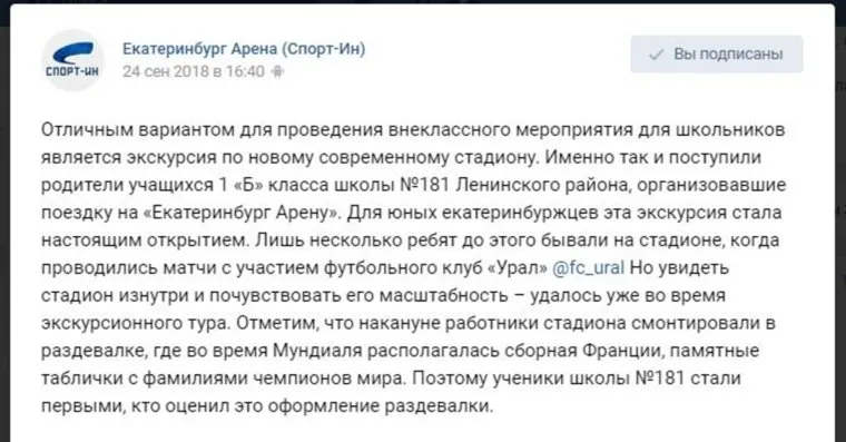 Экскурсия первоклашек стала для арены настолько памятным событием, что ей посвятили отдельный пост