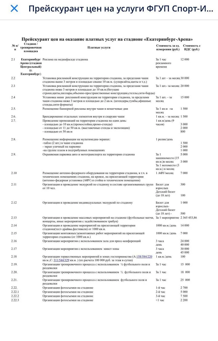 Анонимный источник агентства поделился с «URA.RU» копией документа. В нем 22 пункта, самое дорогое предложение касается проведения массовых мероприятий на стадионе (футбольные матчи, концерты иные мероприятия с задействованием трибун) — 2,365 млн рублей. Еще можно арендовать прилегающую территорию (от тысячи квадратов за 14 тысяч рублей в день), зал для пресс-конференций (40 тысяч в день), микст-зону, где спортсмены общаются с прессой (45 тысяч в день)… «Цены рыночные, средние», — поделился собеседник агентства.