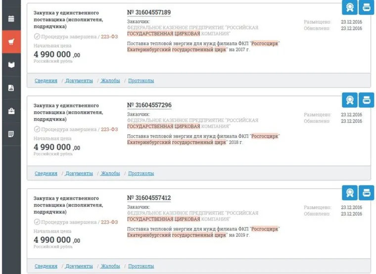 Но самое интересное кроется в госзакупках. В декабре 2016 года компания «Марус» выиграла контракт на отопление Екатеринбургского цирка в 2017 году. А в этот же день получила еще две закупки на отопление в 2018 и 2019 годах. Каждый контракт стоит 4,9 млн рублей — в общей сложности почти 15 миллионов.