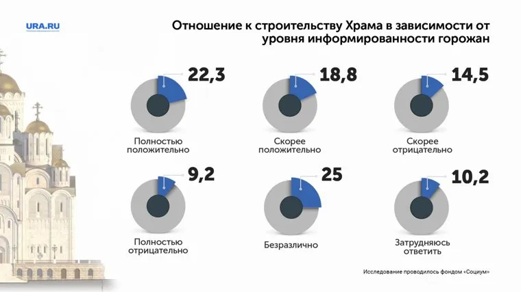 Социологи представили данные о поддержке храма в двух разрезах: в целом по городу и в зависимости от места проживания респондента. Среди тех, кто живет рядом с будущим храмом, полностью положительно к нему относятся 44,2%, скорее положительно — 11,5%, скорее отрицательно — 9,6%, полностью отрицательно — 11,5%, безразлично — 17,3%. Затруднились с ответом 5,8% опрошенных. В целом по городу полностью положительно относятся 22,3% опрошенных, скорее положительно — 18,8%, скорее отрицательно — 14,5%, полностью отрицательно — 9,2%, безразлично — 25%. 10,2% опрошенных затруднились с ответом.