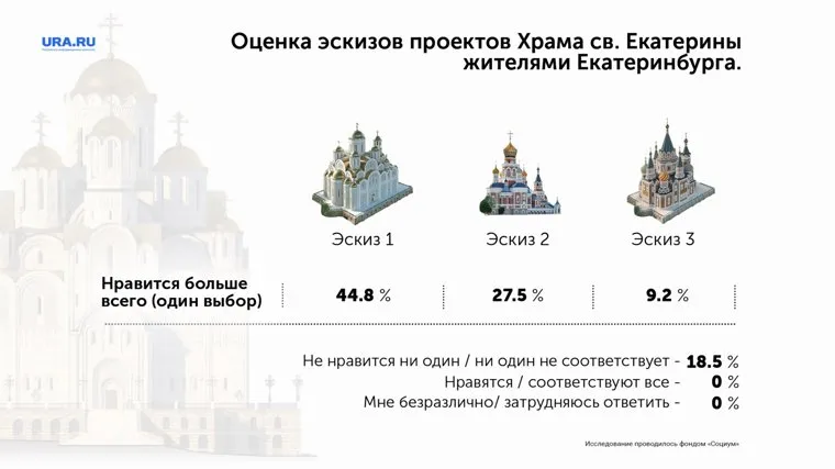 Все тот же первый вариант, к слову, победил, даже когда респондентам дали возможность выбрать сразу несколько понравившихся эскизов: «византийский» храм набрал 57,3%, «островной» — 42,7%, а альтернативный храм с конусообразными куполами и золотыми маковками — 27%.