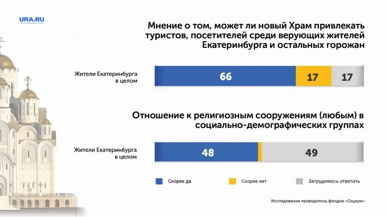 Екатеринбуржцы согласились с логикой меценатов, убежденных в необходимости храма. Опрашиваемым были предложены несколько позиций как в поддержку религиозных сооружений, так и против них. Респонденты могли дать несколько ответов. 87% уверены, что верующие должны иметь помещения для молитв и служб, более 80% считают, что культовые сооружения красивы и могут привлечь туристов, став достопримечательностью, отражающей культуру народа.