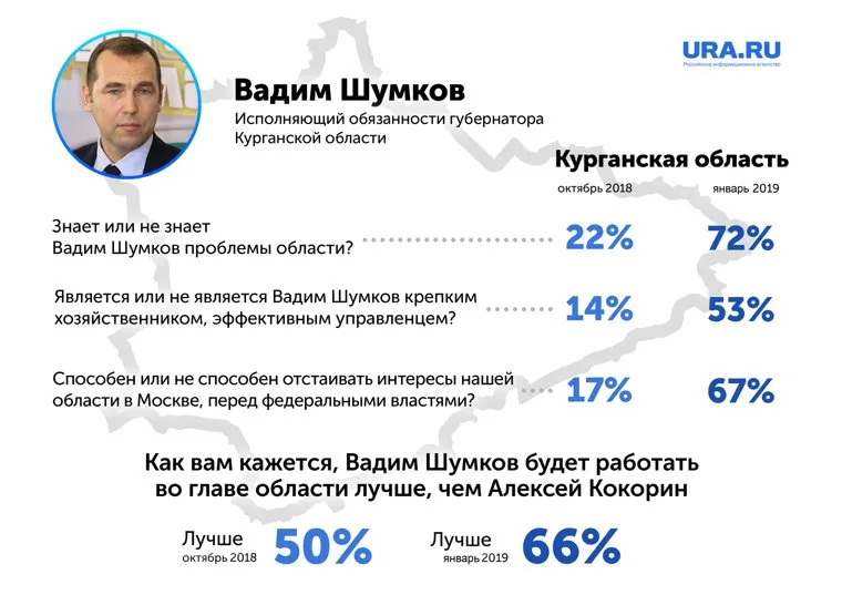 Количество уверенных в том, что Шумков является крепким хозяйственником, выросло с 14% до 53%, а убежденность в том, что он способен отстаивать интересы нашей области в Москве, перед федеральными властями — с 17% до 67%. В целом количество зауральцев, считающих, что новый губернатор будет работать лучше, чем предыдущий, выросло с 50% до 66%.