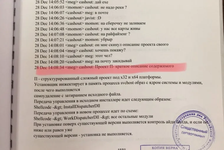 — В уголовном деле есть переписка в «Джаббере» людей с никами Meg и Cashout, она содержалась на жестком диске, изъятом во время обысков. В этой переписке «Мег» предлагает «Кэшауту» воспользоваться проектом «П» и передает ему сперва описание этой программы (декабрь 2015), а затем исходный код (январь 2016). В ней прямо описано, как будут уходить деньги из банков, в том числе из «Металлинвеста» (то, что и вменяется группировке «Лурк»). А в 2018 году в США были опубликованы коды вируса Pegassus — если сравнить, то мы увидим, что Пегас и проект «П» — это одно и то же, один и тот же код. Он стоит миллионы.