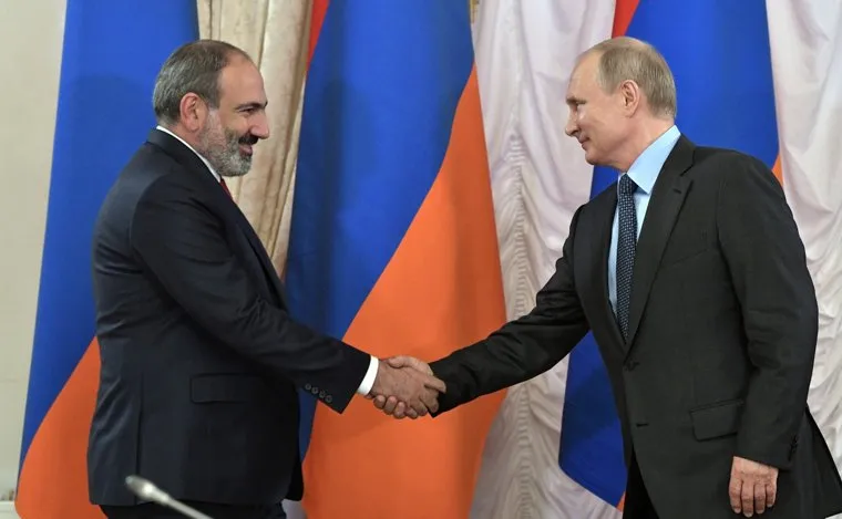 Свое выступление премьер Армении Никол Пашинян (слева) начал с подсчета многочисленных за последний год встреч с Владимиром Путиным (справа)