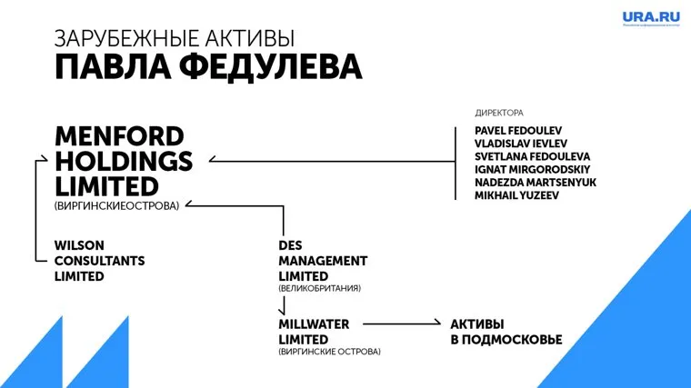 По данным ICIJ, у MENFORD HOLDINGS LIMITED два собственника. Первый — виргинская фирма Wilson Consultants Limited, второй — предприятие в юрисдикции Великобритании Des Management Limited. Последняя фирма, в свою очередь, владеет виргинским офшором Millwater Limited, собственники которого контролируют ряд коммерческих активов, расположенных в поселении Сосенское (Москва). В последнем случае речь идет о разнородных бизнесах — от сельскохозяйственных и фармацевтических предприятий до фирм, занимающихся инженерными разработками. Уставной капитал ряда из них составляет десятки миллионов рублей.