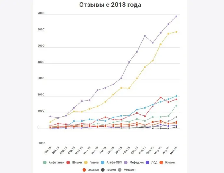 Главная тенденция последних лет — резкое увеличение доли синтетических наркотиков: количество отзывов по ним за год выросло на сотни процентов: гашиш — на 722%, мефедрон — 730%, альфа-ПВП — на 1150%. «Этот наркотик является самым опасным и вредным из всего списка, он способен вызывать сильную психологическую и физическую зависимость и пагубно влиять на центральную нервную систему человека, — говорит эксперт. — Мефедрон и Альфа-PVP — „дизайнерские“ наркотики и раньше легально продавались под видом „Солей для ванн“, отчего получили название „соли“».
