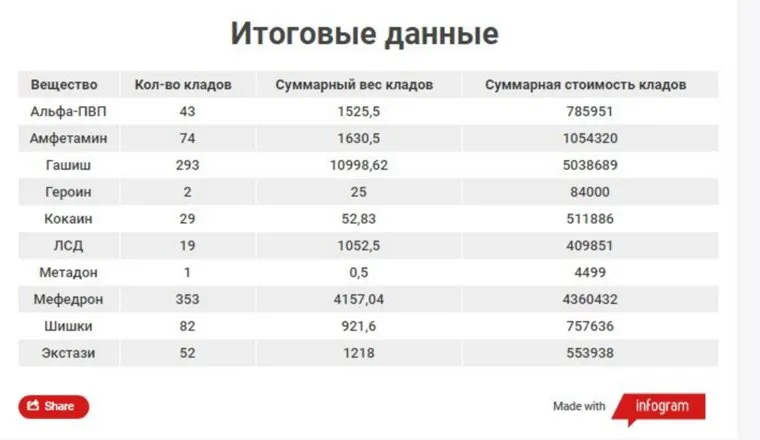 «На площадке продаются различные услуги в виде взлома, хакинга, отмыва денег, а также фальшивые документы, кредитные карты и SIM-карты, но основное — это наркотики: на ней продается более 40 различных наркотических веществ, — говорит исследователь. — Наибольшую популярность снискали всего шесть наркотиков: гашиш, «шишки» (соцветия марихуаны), кокаин и синтетические наркотики: амфетамин, мефедрон и альфа-ПВП (А — пирролидинопентиофенон, или, в простонародье, «флакка»).