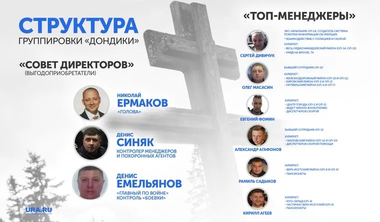 Денис Синяк держит всю структуру, чтобы информаторы сливали данные и чтобы агенты выезжали к родственникам умершего и их обрабатывали. За это отвечают «менеджеры» — Олег Масасин, Евгений Фомин, Александр Агафонов, Рамиль Садыков, Кирилл Агеев.