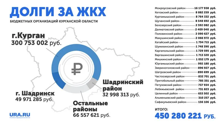 Общий долг бюджетов разных уровней поставщикам коммунальных услуг, по данным АО «Энергосбытовая компания «Восток», на 5 ноября составил более 450 млн рублей — это задолженность более чем за четыре месяца. В энергокомпании отметили, что текущий долг оказался не слишком большим из-за того, что в течение сентября многие муниципалитеты закрыли значительную часть неплатежей (более 245 млн рублей). Долг снизился после того, как Зауралье получило беспрецедентную помощь от Минфина. Области было выделено около четырех миллиардов рублей на подготовку к зиме и решение других неотложных проблем.