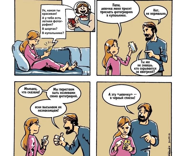 — Обучать, помогать, поддерживать. Ни в коем случае не запугивать (туда-сюда не ходи, там тебя убьют-изнасилуют), а учить правилам безопасности, в том числе в интернете. И родители должны контролировать интернет-активность ребенка. Дети часто боятся сказать, что у них происходит в личной жизни — на этом страхе и играют педофилы. Детям вообще сложно говорить «нет», тем более взрослым: общество учит их послушанию, особенно в школе.