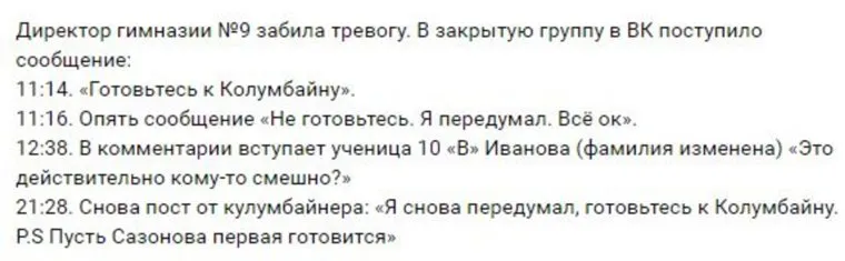 — Мы постоянно мониторим соцсети. В понедельник утром один из сотрудников школы обнаружил в чате, в котором много детей из нашей гимназии, запись одного из учеников, которая содержала слово «Колумбайн». Никаких комментариев, пояснений к нему не было — только это слово. Но поскольку я понимаю, что это означает, я сразу же сообщила об этом правоохранительным органам и в департамент образования, а также в прокуратуру города и района.