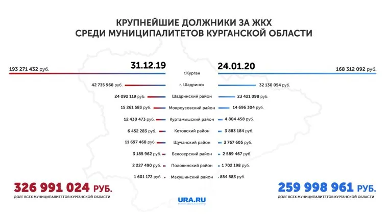 Лидер рейтинга должников по-прежнему Курган . По данным АО «ЭК «Восток», на 24 января долг столицы Зауралья за электроэнергию, отопление и водоснабжение составляет 168 млн рублей — в эту цифру входят неплатежи бюджетов разных уровней, а не только муниципалитета. По уточненным данным, на 31 декабря задолженность была выше — на уровне 193 млн рублей. В пресс-службе мэрии заявили URA.RU, что просроченной задолженности за ЖКХ по состоянию на 20 января у муниципалитета нет.