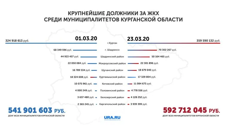 По данным АО «ЭК «Восток», на конец марта общий долг муниципалитетов Зауралья составляет почти 600 млн рублей ( в конце января долг был 260 млн рублей ). Бессменный лидер — Курган (глава города Андрей Потапов). Столица области задолжала за свет, тепло и воду 360 млн рублей (в расчетах учитываются долги администрации и бюджетных учреждений муниципального и областного уровней). Для сравнения: в начале года долг был порядка 170 млн рублей. В адрес администрации Кургана направлен запрос, ответ пока не поступил.