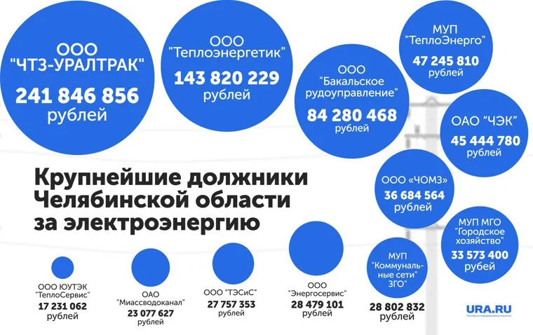 МУП «ТеплоЭнерго» (Катав-Ивановск, директор Сергей Жидов) задолжало 47 млн рублей, ООО «ЧОМЗ» (Челябинск, директор Михаил Кирьянов) — 36,6 млн рублей. ОАО «Миассводоканал» (Миасс, директор Сергей Портной) должно 23 млн рублей, но компания погасила 10 млн накопившегося ранее долга. Среди крупнейших должников за электроэнергию Челябинской области также МУП «Коммунальные сети» ЗГО (директор Виктор Пфафенрот, долг 28,8 млн рублей), ООО «Энергосервис» (Юрюзань, директор Виктор Малахов, долг 28,4 млн рублей), ООО «ТЭСиС» (директор Владимир Чебыкин, долг 27,7 млн рублей), МУП МГО «Городское хозяйство» (Миасс, директор Рима Щербакова, долг 33,5 млн рублей), ООО ЮУТЭК «ТеплоСервис» (Карталы, директор Игорь Трофимов, долг 17,2 млн рублей). Связаться с руководителями этих компаний на момент публикаций не удалось. В приемных либо не ответили на звонки, либо сообщили, что руководителей нет на месте.
