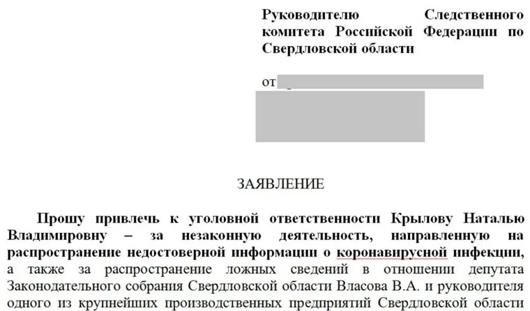 «Крылова… обвинила в распространении коронавируса депутата заксорания Свердловской области Власова В.А. и распространила эту информацию в средствах массовой информации, — говорится в заявлении в СК. — Более того, Крылова осуществила распространение ложной информации о коронавирусной инфекции, требуя отменить создание обсервации под Асбестом на базе лагеря „Заря“ — данная информация на тот момент уже была опровергнута заместителем губернатора Свердловской области».