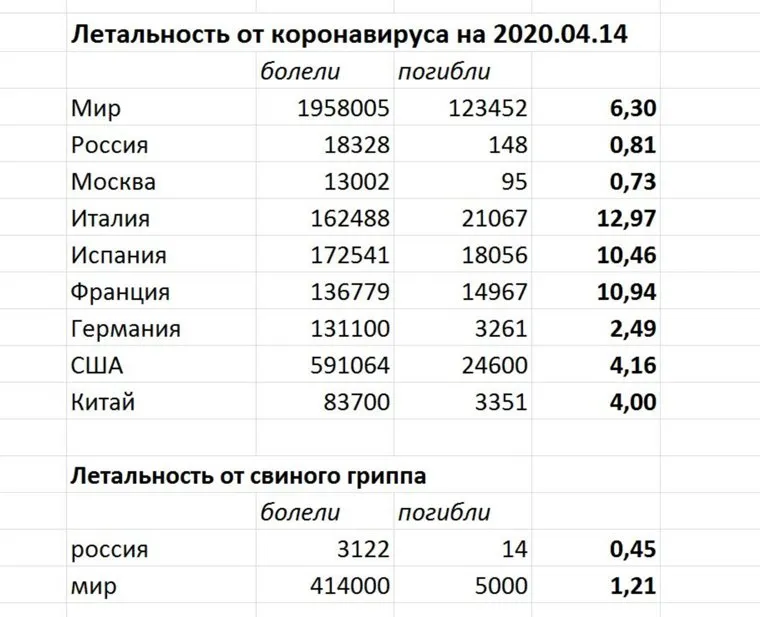 — Я не раз слышал оценки врачей (в том числе маститых, например, главного инфекциониста России ), что коронавирус — это не то, чего надо бояться, что обычный грипп страшнее — у него мол, тяжелее течение заболевания и выше летальность (число умерших среди заболевших). Но сегодня в мире — почти 2 млн заболевших и 135 тысяч умерших от COVID-19. В среднем по миру это 6,3%.