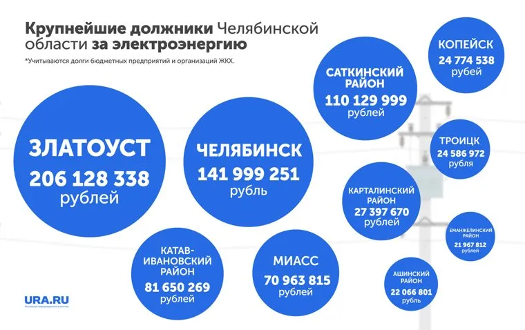 В числе крупных должников также Карталинский район (глава Анатолий Вдовин, долг — 27,4 млн рублей), Копейск (глава Андрей Фалейчик, долг 24,8 млн рублей), Троицк (глава Александр Виноградов, долг — 24,6 млн рублей), Ашинский район (глава Виктор Лукьянов, долг 22 млн рублей), Еманжелинский район (глава Евгений Светлов, долг — 21,9 млн рублей). За электроэнергию должны бюджетные структуры и коммунальные предприятия в Чебаркуле (глава Сергей Ковригин, долг 20,1 млн рублей), Верхнем Уфалее (глава Вера Ускова, долг 19,3 млн рублей), Каслинском (глава Игорь Колышев, долг 14,5 млн рублей), Нагайбакском (врио главы Иван Сурменев, долг 14,4 млн рублей), Сосновском (глава Евгений Ваганов, долг 14,2 млн рублей) районах. 13,2 млн рублей — долг в Кыштыме (глава Людмила Шеболаева), в Еткульском районе (глава Юрий Кузьменков) — 11,3 млн рублей, в Озерске (глава Евгений Щербаков) — 10,7 млн рублей, в Кусинском районе (глава Юрий Лысяков)— 10,5 млн рублей.