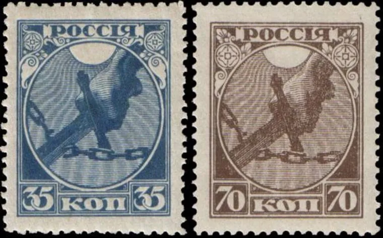 Еще одна почтовая марка РСФСР, считается самой первой новой республики. Вокруг нее долго велись споры о том, кто же ее отпечатал и в каком году. Только в 2006-м филателисты договорились (не без длительной работы в архивах), что марки с рисунком «Рука с мечом, разрубающим цепь» и номиналами 35 и 70 копеек были выпущены в почтовое обращение специальным постановлением Наркомата почт и телеграфов только 25 октября (7 ноября) 1918 года. Этот выпуск был признан «Первым революционным выпуском РСФСР», приуроченным к первой годовщине Октябрьской революции. Этим историческим спором марка и ценна, хоть и не очень. Обычная стоимость лота — 500 рублей за марку. Но известно, что номинал марки в одну копейку (которая никогда массово не выпускалась) оценивается уже в 12-15 тысяч долларов США.