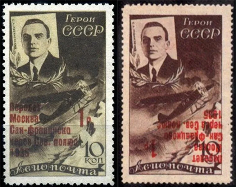 Уже марка СССР. Ее ценность в истории появления надпечатки (оттиска). На марке изображен бюст пилотa Леваневского, который должен был совершить исторический полет по маршруту Москва — Сан-Франциско. Но полет не состоялся, а марки были уже отпечатаны. Этому и посвящена надпечатка. Их несколько видов: с маленькой буквой «ф» в словe «Сан-Франциско», с перевернутой надпечаткой (видимо сделано это по ошибке, таких марок сейчас не больше пяти штук и они самые дорогие среди всех подобных). По легенде надпечатку сделали на нескольких марочных листах по указанию наркома внутренних дел Генриха Ягоды, который был известен как филателист. Стоимость этих марок разная, а зависимости от оттисков. В 2008 году марка с дефектом былa продана на аукционе Cherrystone в Нью-Йоркe за 525 000 доллaров.