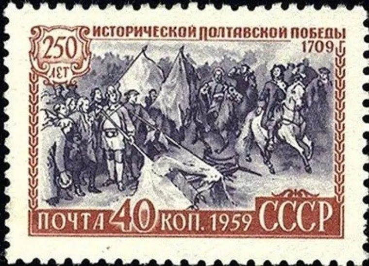 Редчайшая и красивейшая, по мнению опытных филателистов, марка в мире. Ценна своей историей и тем, что официально продавалась лишь несколько минут. На марке номиналом 40 копеек — попавшие в плен шведские войска во главе с премьер-министром Карлом Пипером и фельдмаршалами складывают флаги перед Петром I. Тираж был изготовлен чтобы «уколоть» шведов, но когда он был отпечатан — отношения СССР и Швеции восстановились и тираж марки был уничтожен, чтобы не обижать новых дипломатических партнеров. Сохранилось 40 марок. Купить их можно на нечастых аукционах по цене от 10 до 20 тысяч долларов США.