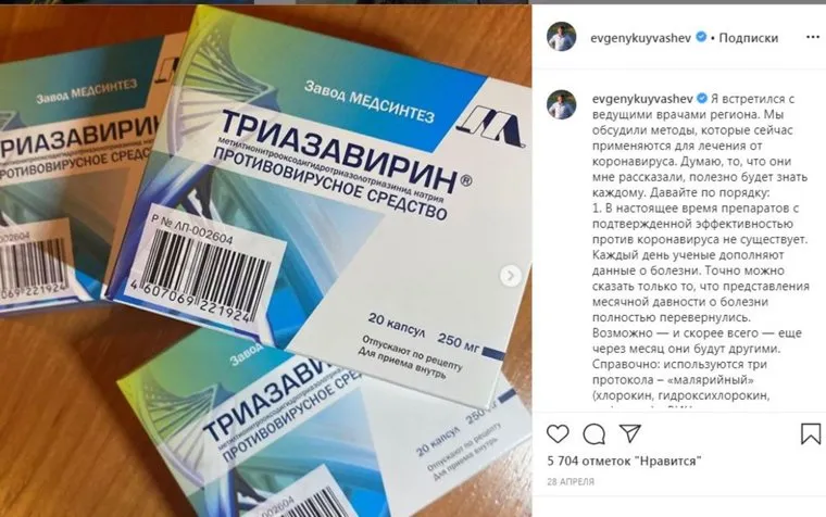 В конце апреля триазавирин «прорекламировал» в своем Instagram (деятельность запрещена в РФ) Евгений Куйвашев