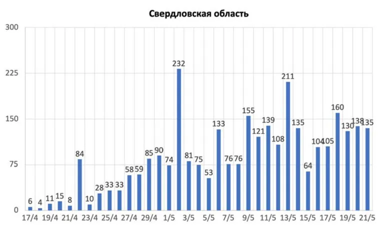 Для контраста — Свердловская область. Мы видим, где хаотичное колебание день ото дня. И я думаю, что это как раз признак того, что цифры настоящие. Они и посчитаны на основе суммирования количества положительных тестов. А не придуманы, чтобы регион был на хорошем счету в глазах федерального начальства.