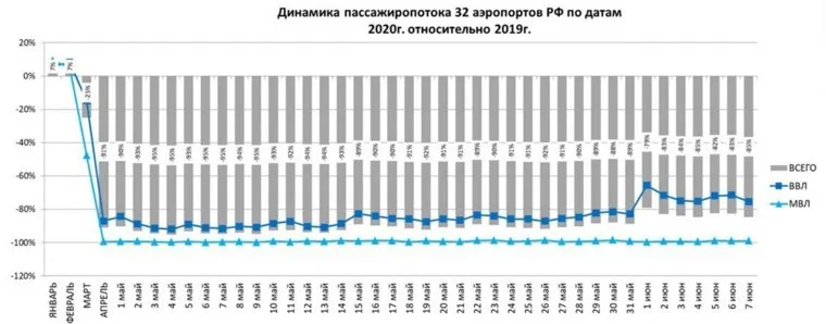 По оценке гендиректора «Ассоциации агентств воздушного транспорта» Сергея Демиденко, пассажиропоток в России за последние дни вырос примерно на 10%, продажи билетов — еще сильнее. Однако он уточнил, что официальная статистика этих изменений будет доступна позже. Пока о росте числа перевезенных пассажиров можно судить по данным Международной ассоциации аэропортов (объединяет 32 российских аэропорта). Согласно данным сайта МАА, падение пассажиропотока в начале мая составило от 90% до 95% от уровня перевозок аналогичного периода 2019 года. В первые дни июня снижение от уровня прошлого года колебалось в промежутке от 79% до 85%.