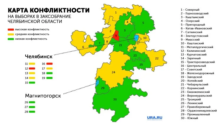 В большинстве округов на выборах в Заксобрание Челябинской области ожидаются конфликты. У политблока губернатора Алексея Текслера, который возглавляет списки «ЕР» на выборах, основная задача состоит в том, чтобы «Единая Россия» взяла большинство мандатов не только по партийным спискам, но и по всем одномандатным округам. Пока можно не волноваться только за 14 из 30-ти округов. URA.RU подготовило карту конфликтности, с инсайдами о будущих войнах.
