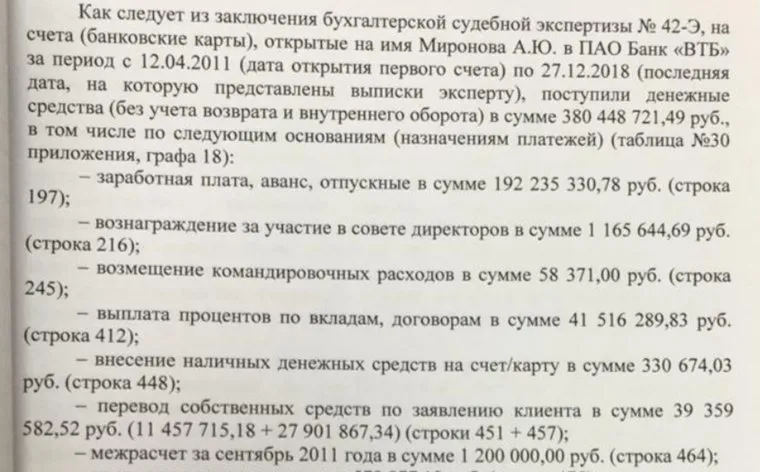 Так, с 2011 по 2018 годы на счета Миронова в ПАО «Банк «ВТБ» поступило 380 млн 448 тысяч 721 рублей 49 копеек. При этом официальные доходы Миронова и его супруги составили 98 млн 087 тысяч 894 рубля 10 копеек за 2016—2017 годы и 6 млн 998 тысяч 965 руб 56 копеек за 2018—2019 годы.
