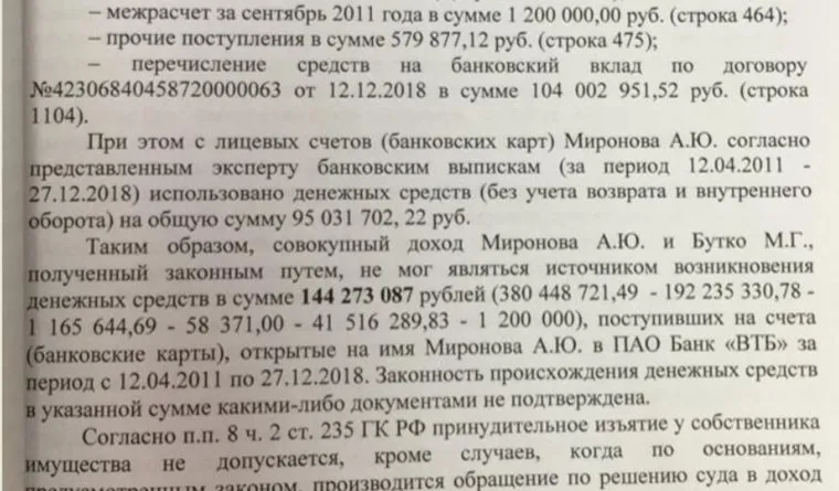 «Таким образом, совокупный доход Миронова А.Ю. и Бутко М.Г., полученный законным путем, не мог являться источником возникновения денежных средств в сумме 144 273 087 рублей, поступивших на счета Миронова А.Ю. в ПАО „Банк ‚ВТБ‘, — говорится в иске. Данная сумма рассчитана как разница между 380 миллионами и суммами, которые следствие считает полученными законными путем (зарплата, бонус за участие в совете директоров, компенсация командировок, проценты по вкладам и ‚межрасчет‘).