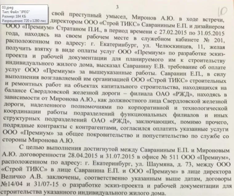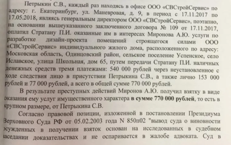 Всего в иске фигурируют три взятки. Первая на сумму 727 тысяч 595 рублей — стоимость разработки эскиз-проекта и рабочей документации дома Миронова в силе Иславском на Рублевском (Одинцовский район Московской области). Работы выполнял екатеринбургский дизайнер Павел Стратан, а оплатил бизнесмен Евгений Савранин, чьи фирмы выполняли подряды на железной дороге.