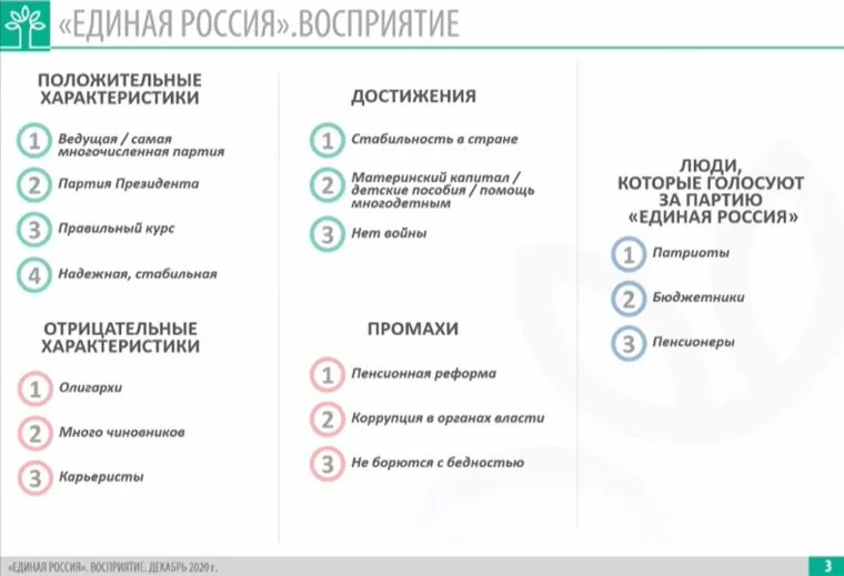 Руководитель практики политического анализа ВЦИОМ Михаил Мамонов рассказал, что по данным самого свежего социологического исследования (от 2 декабря), у ЕР рейтинг 32% — это больше, чем у КПРФ (14%), ЛДПР (11%) и «Справедливой России» (6%) вместе взятых. «За ЕР голосуют патриоты, бюджетники и пенсионеры», — показал он лицо электората партии.