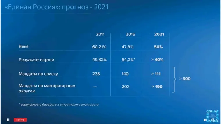 Благодаря этим технологическим решениям Костин рассчитывает, что партийный список ЕР наберет на выборах 40%-45%. При этом он уточнил, что на региональных выборах 2019 и 2020 годов партия власти получила 52% и 48% соответственно. Так что прогноз можно считать скромным. «Несмотря на все сложности —пандемию, непопулярные законы, которые партия поддерживала, потому что они важны для социальной сферы, — нет ни одного эксперта, который говорит, что ЕР не получит большинство. Но задача — максимальная мобилизация и получение результата [конституционное большинство]», — резюмировал политтехнолог ЕР.