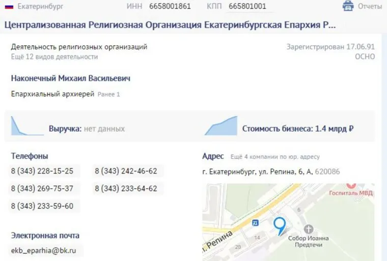 Справочные системы оценивают стоимость активов Екатеринбургской епархии в 1,4 млрд рублей