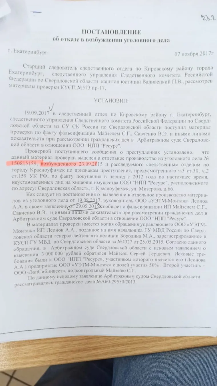 По словам Леонова, он неоднократно обращался в Следственное управление СК России по Свердловской области, где одно из его сообщений о преступлении в отношении Майзеля было передано по подследственности в УМВД России по Екатеринбургу. В постановлении Следственного отдела по Кировскому району Екатеринбурга сообщается, что показания Леонова о том, что Майзелем предприняты меры к фиктивному банкротству ООО «НПП «Ресурс» подтверждается материалами проверки. По другому заявлению в этом же Следственном отделе признали факт подделки документов, представленных в Арбитражный суд, но отказали в возбуждении уголовного дела в связи с истечением срока давности привлечения к уголовной ответственности, что прямо противоречит решению Конституционного суда РФ по таким вопросам.