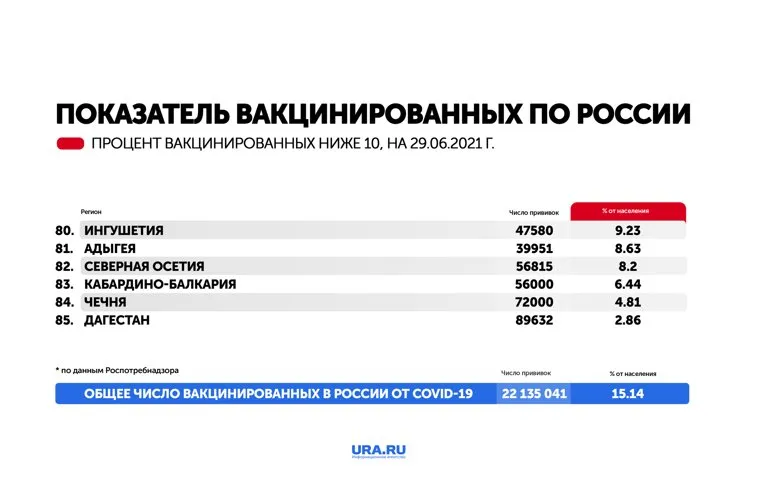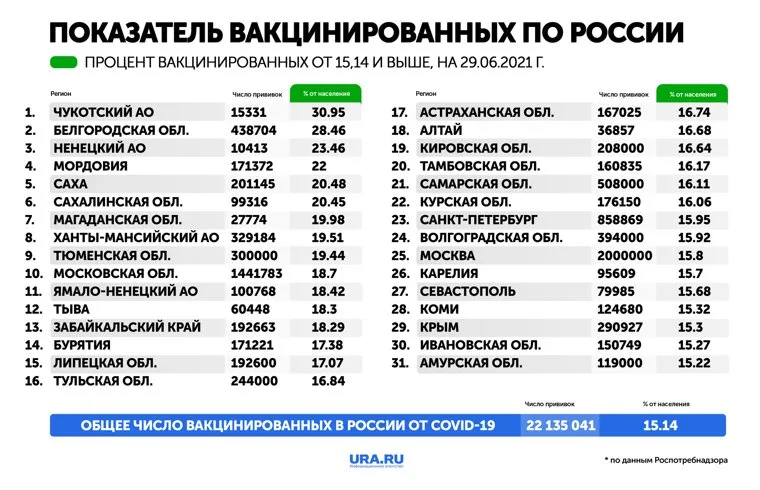 По официальной статистике Роспотребнадзора , на 29 июня в России от коронавируса привито 22,15 млн человек, или 15,14% населения. На основе этих данных URA.RU составило рейтинг регионов по уровню вакцинации.
