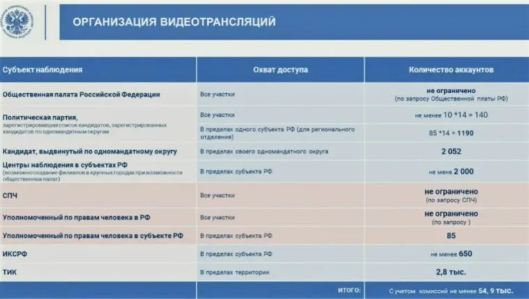 В этом году на 96% избирательных участках и в территориальных избиркомах по всей стране установлено более 50 тысяч видеокамер (по две на комиссию) и 36 тысяч видеорегистраторов (там, где проблемы с интернетом и где нет возможности наблюдать за происходящим в реальном времени). Пять лет назад, на предыдущих парламентских выборах, было лишь около 26 тысяч камер по стране. «Масштаб охвата беспрецедентный. Трансляция и видеофиксация будет вестись непрерывно на протяжении трех суток. В поле зрения видеокамер будут находиться стационарные и переносные ящики для голосования, места для выдачи бюллетеней, места хранения сейф-пакетов, место приема протоколов в ТИКах, места подсчета протоколов», — отметила Памфилова.