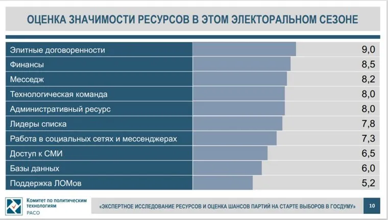 Выводы об элитных договоренностях, как главном инструменте избрания в Госдуму, сделаны по итогам опроса 60 практикующих политконсультантов, уточнили URA.RU в РАСО. Минченко считает, что только от элитных договоренностей зависит, получат ли политики деньги на выборы. «Например, есть информация, что у „Родины“ в начале избирательной кампании нашлись серьезные спонсоры с деньгами. Позже спонсоры от поддержки партии отказались по рекомендации „сверху“. Возникли проблемы с федеральными „кошельками“ и у КПРФ. От них тоже в какой-то момент „отвалились“ большие спонсоры, но тогда коммунисты, чтобы сохранить финансирование, стали привлекать региональных бизнесменов „средней руки“. Получается, когда элитные договоренности изменились, это отразилось и на финансовом состоянии партий», — объяснил Минченко.