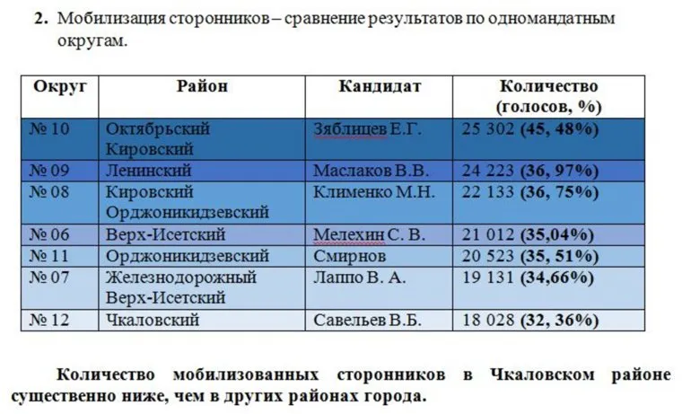 Также в отчете обращается внимание, что администрация Чкаловского района и Савельев хуже остальных отработали мобилизацию сторонников «Единой России»: по этому маркеру территория якобы является аутсайдером в городе. «Количество мобилизованных сторонников в Чкаловском районе существенно ниже, чем в других районах города. <…> Количество сторонников кандидатов [Ивачева и Савельева] в межвыборный период выросло непропорционально. Можно сделать вывод, что работа по привлечению сторонников велась активнее и эффективнее Ивачевым. <…> Таким образом, фиксируется недостаточная мобилизация/недостаточный контроль за мобилизацией/не учитывалась погрешность на каждом этапе передачи данных», — резюмировал автор.