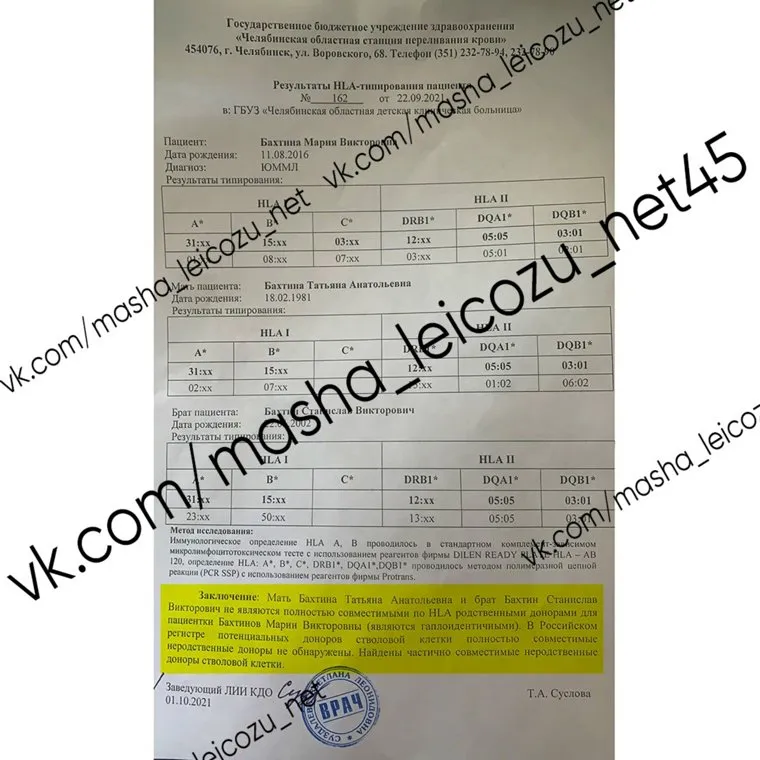 — Сегодня пришли плохие новости. Результаты типирования Маши, мои и сына Стаса. Мы для донорства не подходим. Получила справку, что доноров в России для Маши нет. Это значит, что нужно искать за рубежом, а лечение в европейских клиниках стоит 300-350 тысяч долларов (трансплантация с последующим лечением). Еще не понятно, нам самим придется искать донора в мировой базе, или это делает больница. В понедельник я поговорю с врачом центра им. Блохина. Но уже точно известно, что оплачивать лечение нужно нам самим, — рассказывает Татьяна.