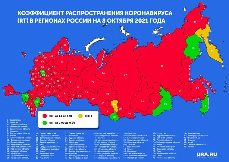 Что касается последнего показателя, то по данным Роспотребнадзора на 8 октября, в России только 10 регионов имеют показатель ниже единицы — когда число вновь заболевших сокращается. Это Санкт-Петербург, Калмыкия, Адыгея, Алтай, Северная Осетия, Краснодарский, Забайкальский и Приморский края, Московская и Магаданская области.