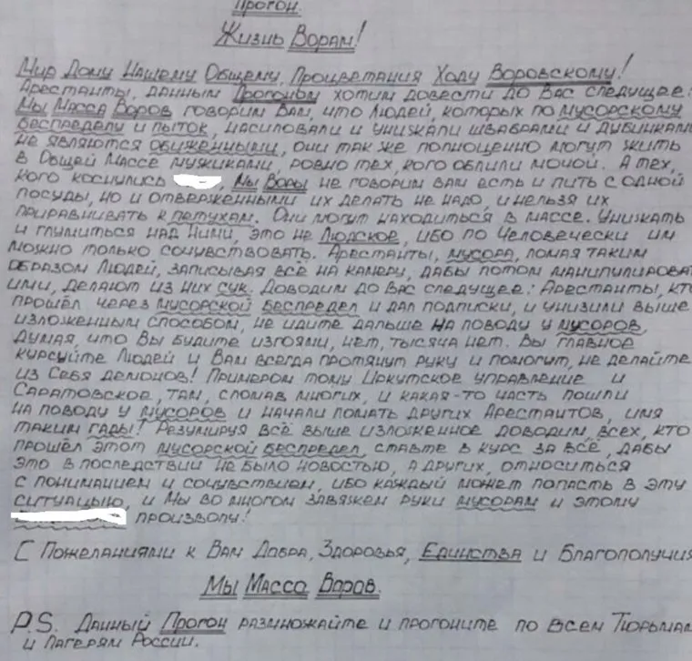 «Мы масса воров, говорим вам, что люди, которых по <…> беспределу насиловали и унижали швабрами и дубинками не являются опущенными. Они также могут полноценно жить в общей массе мужиками…», — говорится в специфическом документе, именуемом на сленге «прогоном». Авторы обращения также призывают не считать опущенными тех, кто подвергался сексуальному насилию, а отнестись к таким арестантам с сочувствием. Тех же арестантов, кто подвергся пыткам и насилию со стороны активистов ФСИН, авторы документа призывают не идти на поводу администрации колоний и не вестись на шантаж.