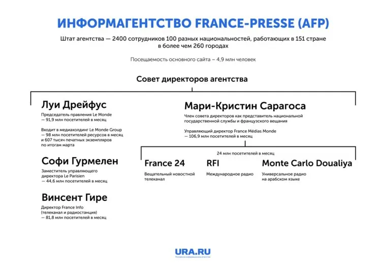 Так, в совет директоров входит председатель правления самой популярной газеты во Франции Le Monde — Луи Дрейфус. Ежемесячная интернет-аудитория издания превышает 91 млн визитов. Издание входит в состав медиахолдинга Le Monde Group, которая включает в себя самые известные французские издания. Общая посещаемость и тираж изданий группы составляет более 98 млн посетителей ежемесячно и 607 тысяч экземпляров. О том, как издания холдинга преподносят своей аудитории происходящее на Украине, URA.RU рассказывало ранее.