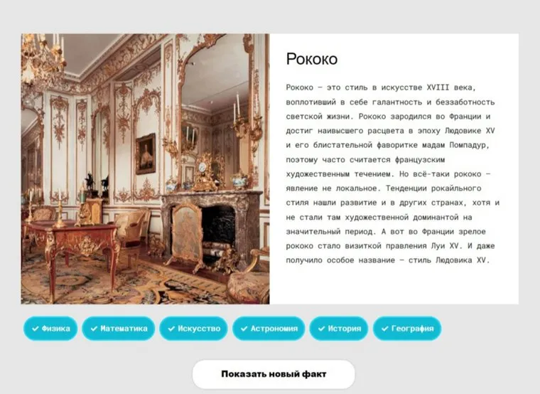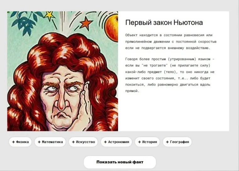 Автор разработал приложение уже для нескольких платформ: Google Play и Windows, а также создал чат-бота в Telegram. Принцип работы софта простой — нажимаешь кнопку с названием области знаний, а программа выдает факт с понятным и интересным описанием. Но пока что система работает в тестовом режиме и количество статей ограничено. «Поэтому сейчас есть проблема — нам нужен редактор, который будет помогать с текстами. Если идея пользователям зайдет, то потребуется наполнить сайт полноценно», — уточняет ученый.