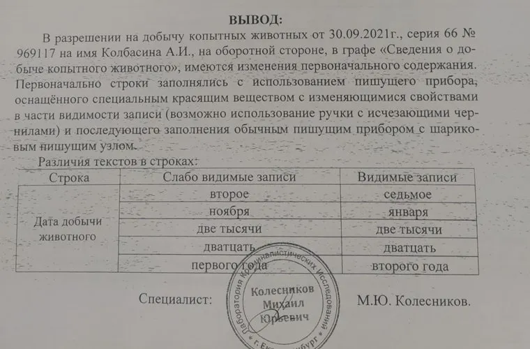Он пришел к выводу, что графа «Сведения о добыче копытного животного» (пол, возраст, вес, место, дата) в разрешениях заполнялась охотниками сначала ручкой с исчезающими чернилами, а затем, по результатам последней охоты, обычной шариковой ручкой. Его заключения есть в распоряжении URA.RU.
