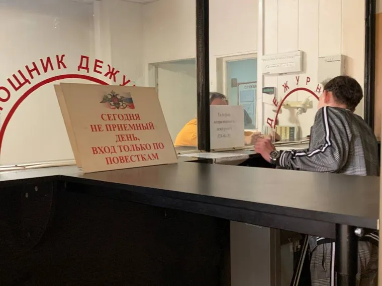 В военкомате Кировского района, на первый взгляд, совсем пусто. На улице нет очередей, а внутри, у стойки дежурного, висит объявление: «Сегодня не приемный день, вход только по повесткам». С дежурной общается молодой человек, которому прислали повестку.